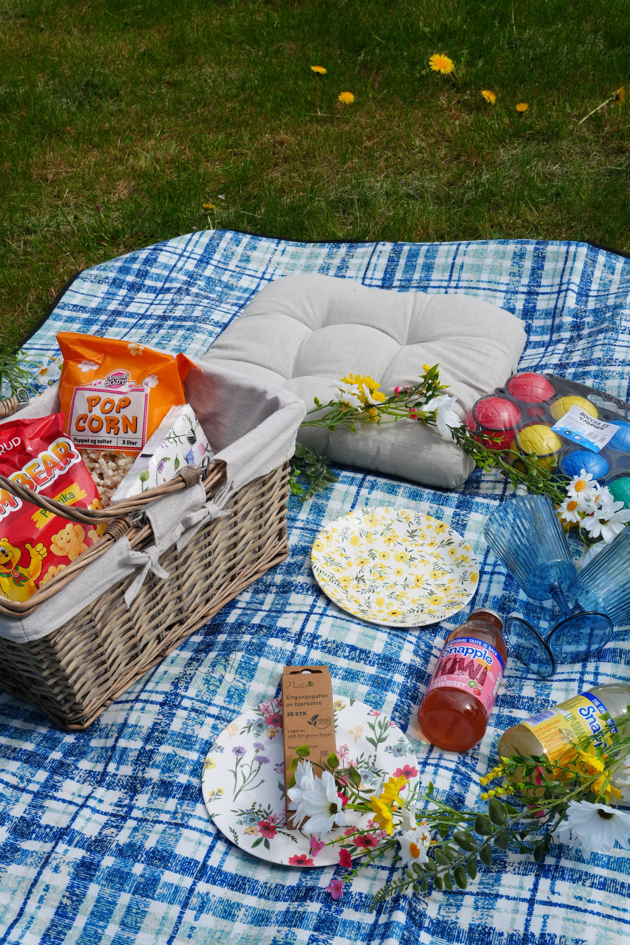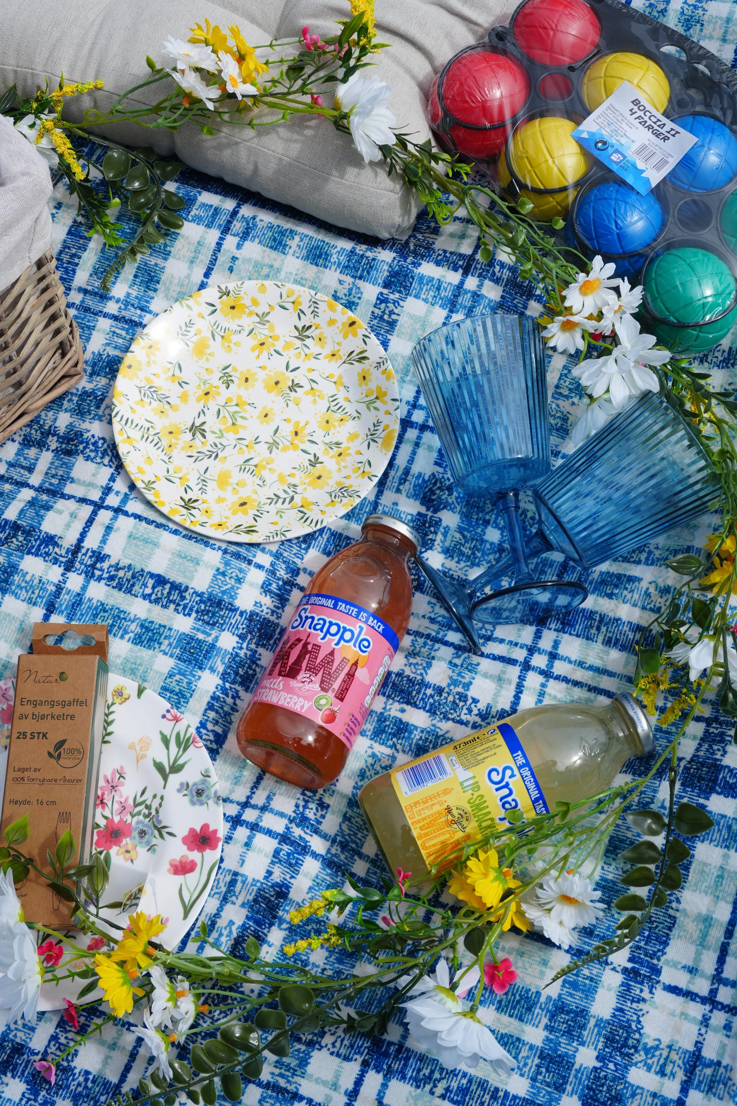 Vakre plasttallerkener i blomstrete mønstre, gjenbrukbare blå plastglass og bærekraftige engangsgaffler i bjørketre gir pikniken et ekstra sommerlig løft – og det er både praktisk og miljøvennlig!